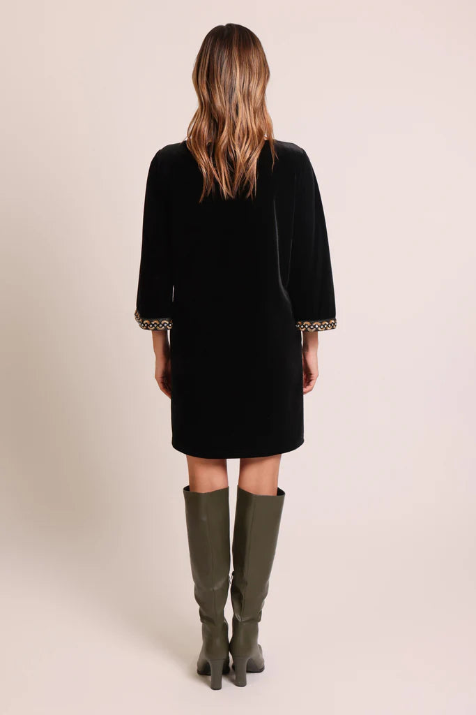 A simple cut yet so elegant, our Bloom Dress is a must-have this season. A tunic style mini dress with 3/4 trumpet sleeves which are finished with a stunning gold beaded embellishment on the cuff. It has a peephole button fastening on the back and even has side pockets. So chic in this soft black velvety fabric. Just style with heels or some knee high boots for a beautiful party outfit.