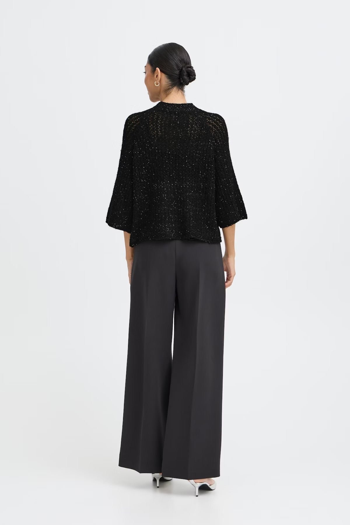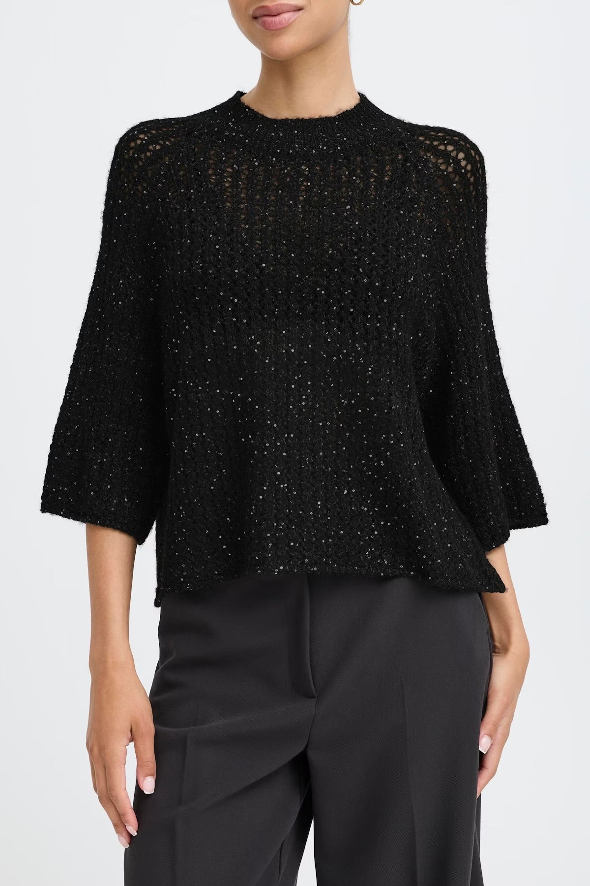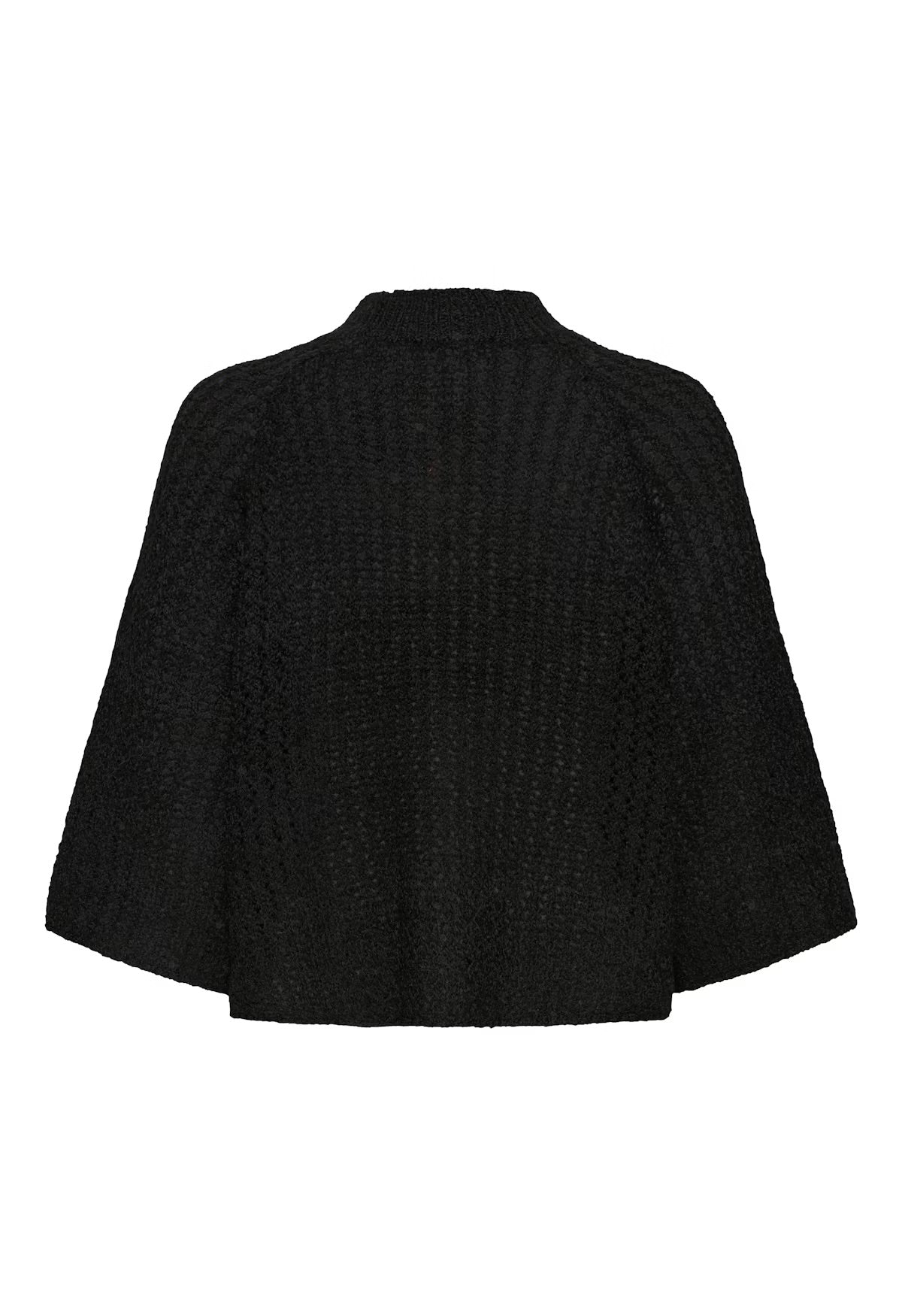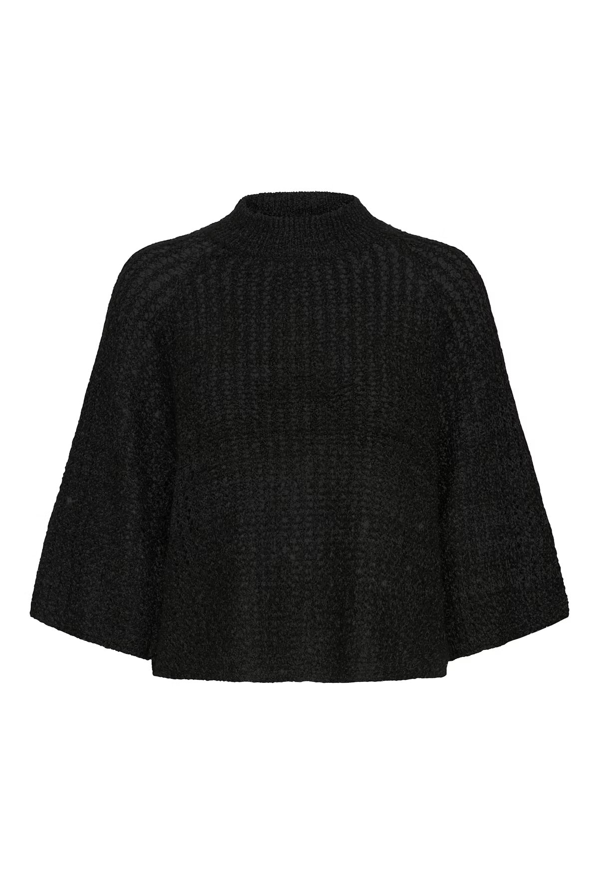 Knitted sweater features a relaxed fit, cropped length, and wide three-quarter sleeves. The mock neckline and soft textured knit make it a versatile layering piece for both casual and office looks.