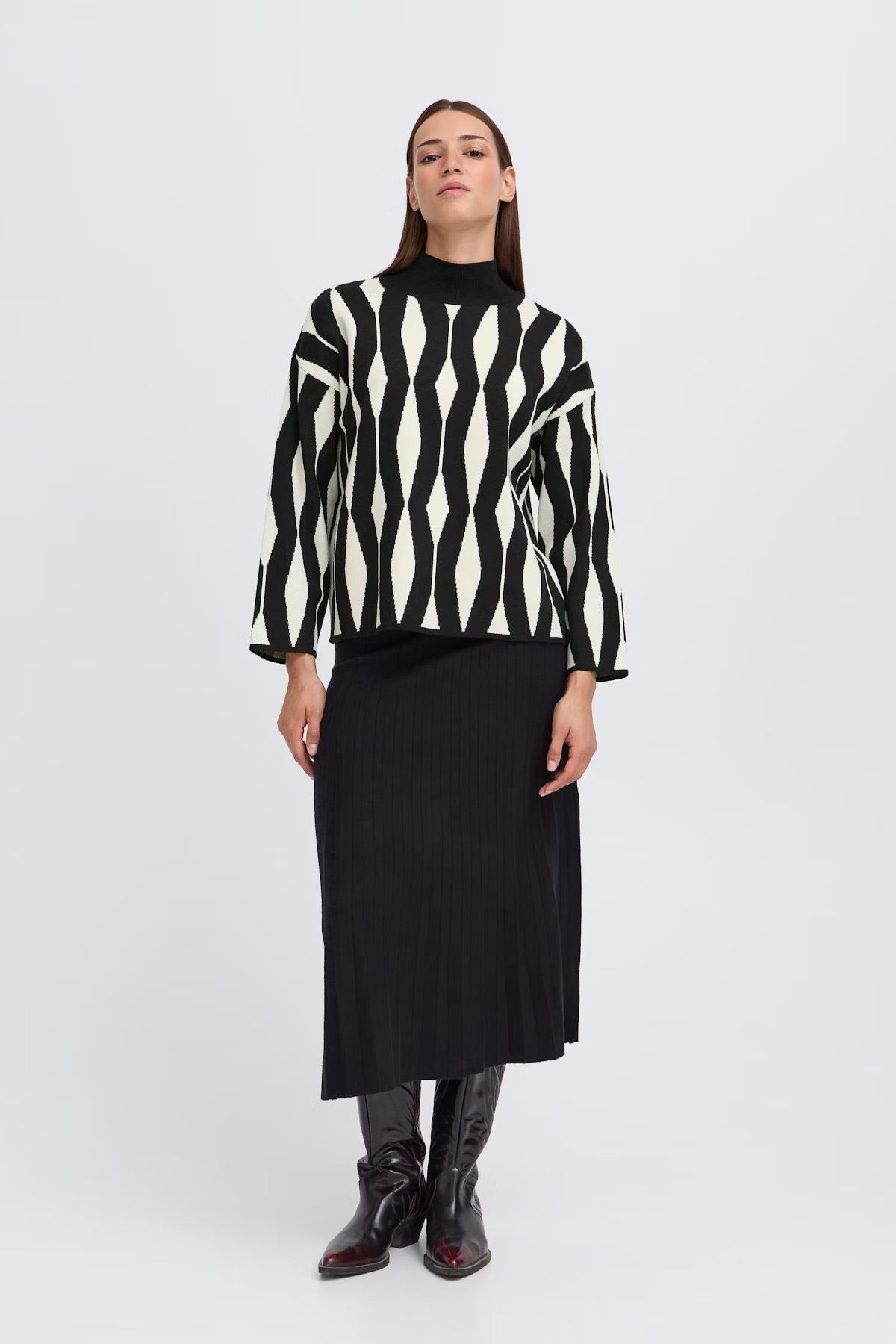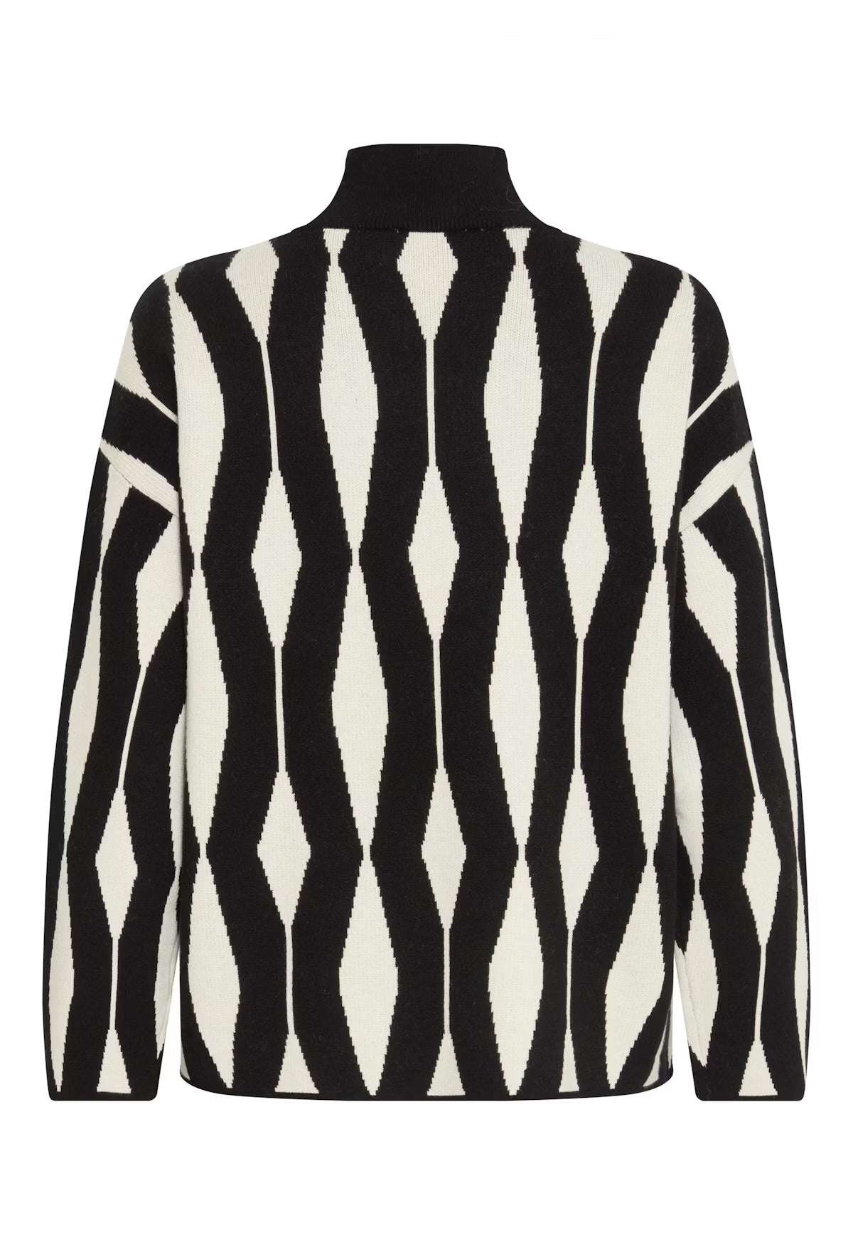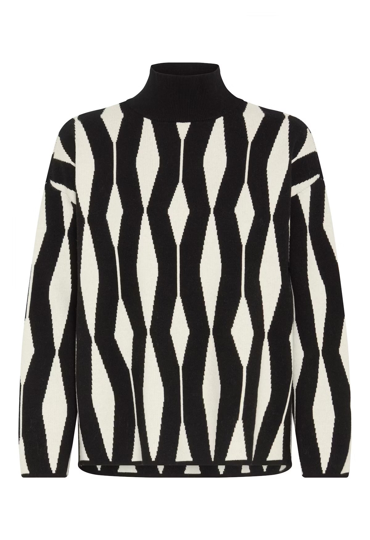 This women's pullover sweater offers a relaxed fit, high neckline, and straight silhouette. Modern geometric design and soft knit ensure comfort and style for versatile everyday wear.