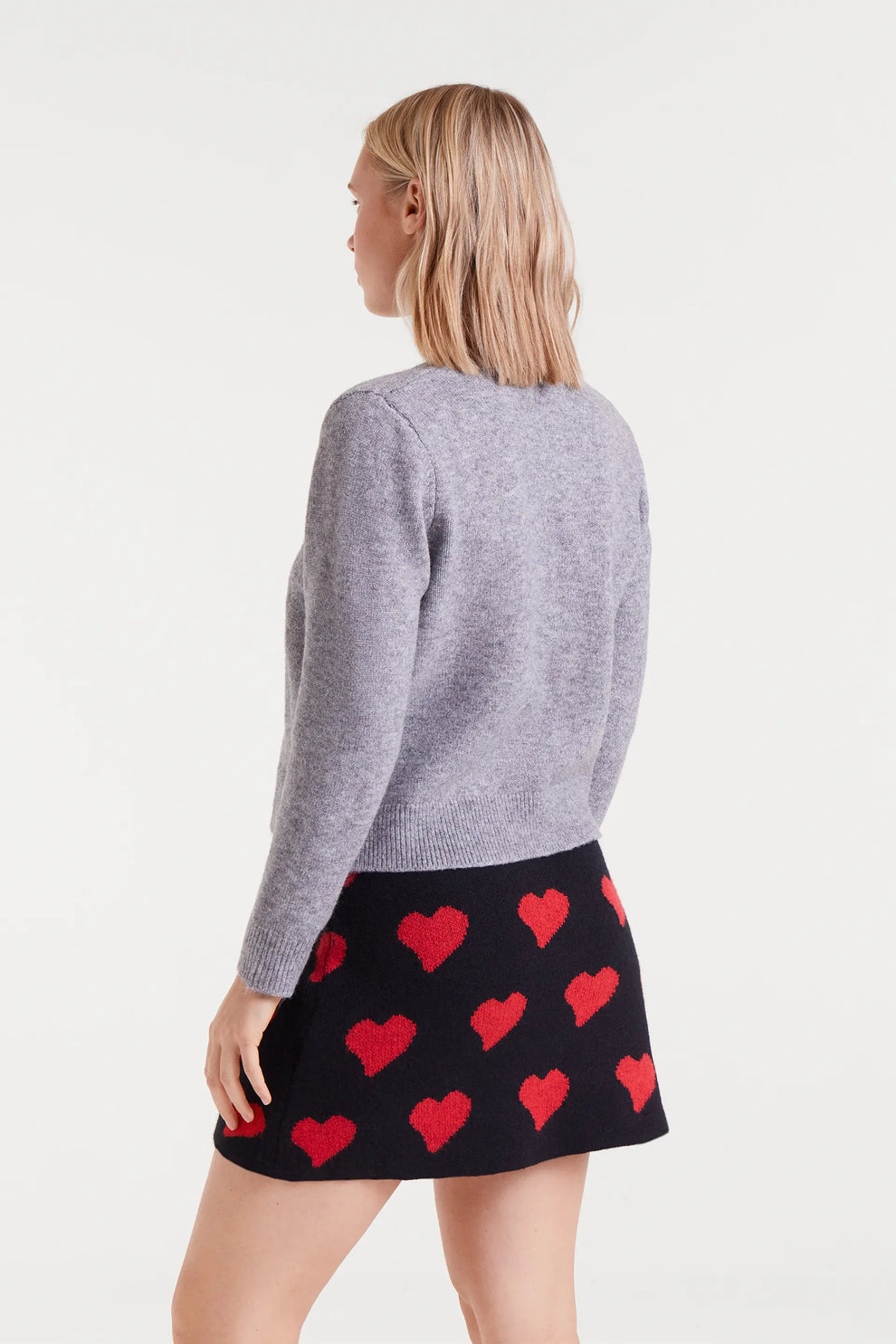 Gray knit cardigan with a round neck and long sleeves. Multicolored button closure at the front. Ribbed details. The model is 179 cm tall and is wearing a size S.