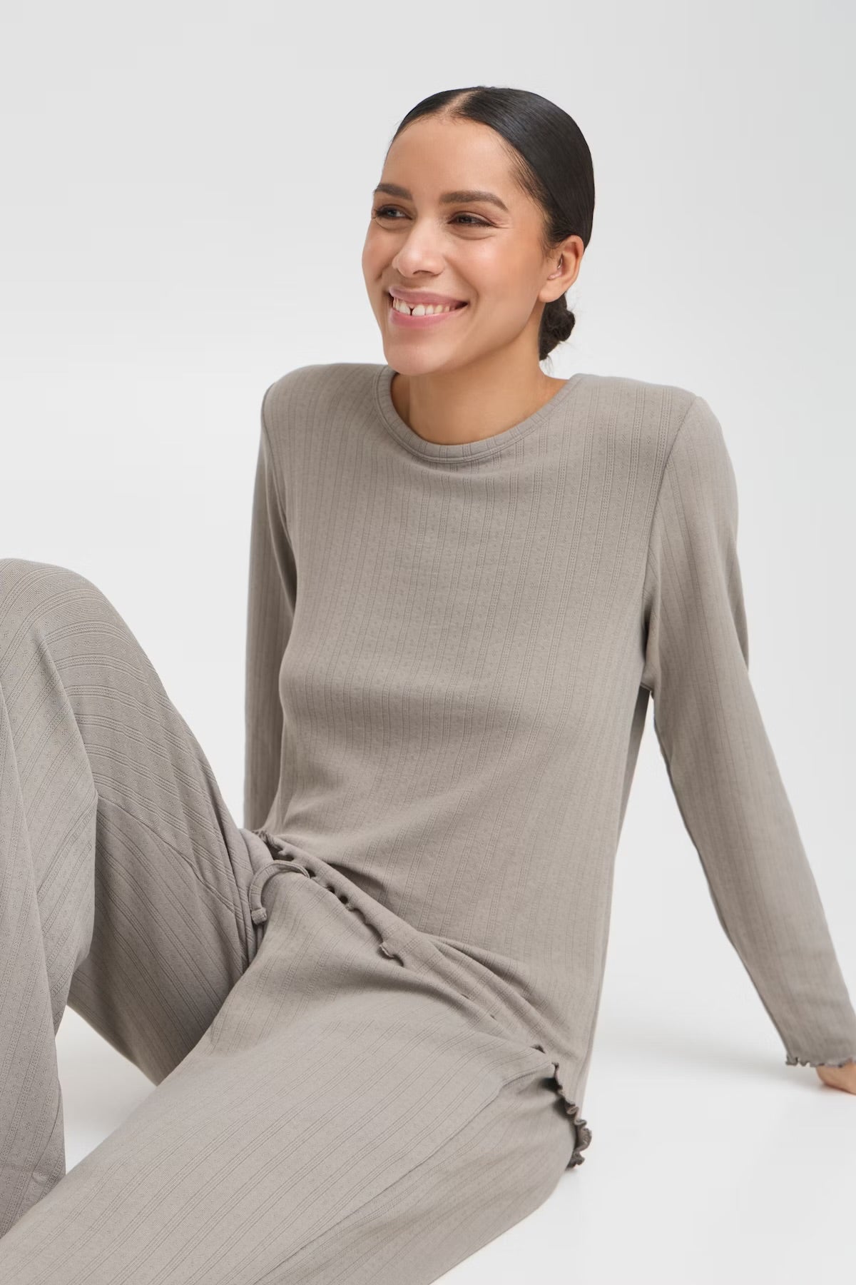 Lounge set with relaxed fit, long sleeves and round neckline offers exceptional comfort for homewear. Wide leg pants and soft fabric design deliver effortless style for everyday relaxation and versatile comfort.