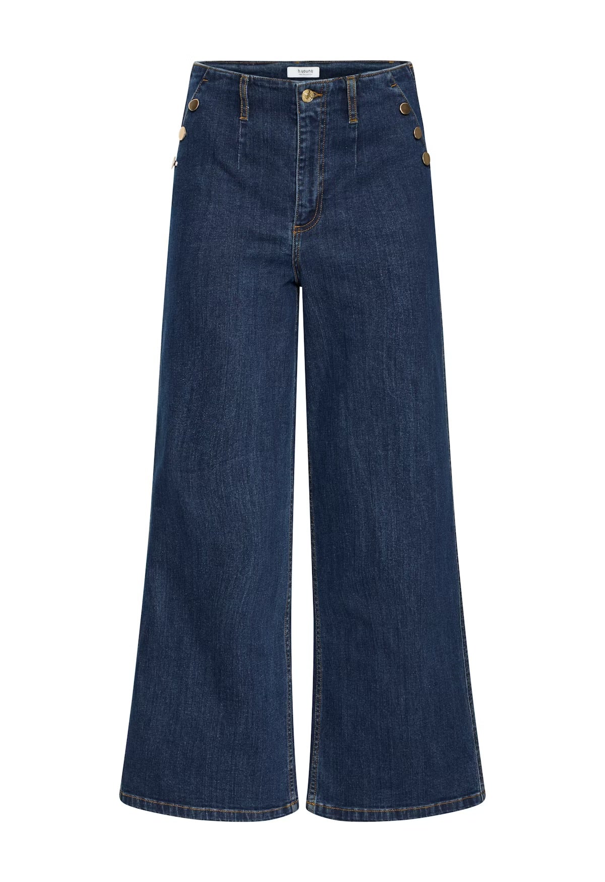 Wide leg jeans for women feature a high-rise fit and button details at the hips. These jeans offer a comfortable silhouette with a cropped length, perfect for versatile, everyday style.
