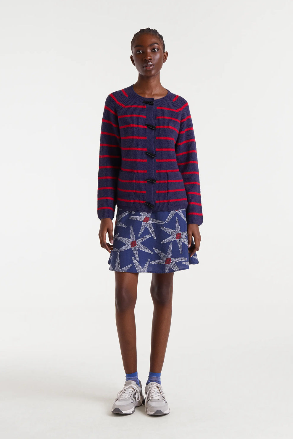 Knit cardigan with a navy blue and red striped print. Round neck and long sleeves. Trench-style front closure. Front pockets. The model is 175 cm tall and is wearing a size S.