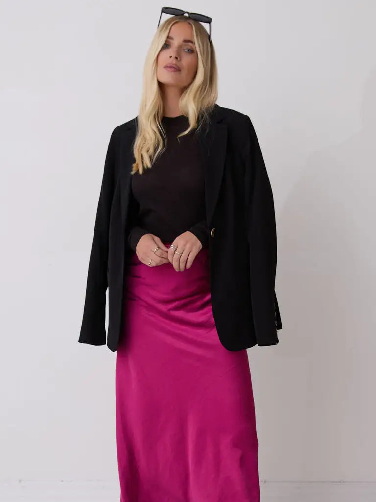 If you only have one skirt in your wardrobe, make it this. A true classic, our beautiful satin skirt is cut on the bias in a midi length and crafted in premium heavier weight satin which falls fluidly over the body to create a flattering silhouette to enhance all shapes. The elasticated waistband ensures comfort and style so is perfect for all occasions. Dress up with heels, or down with a simple tee, blazer and trainers - the ultimate versatile staple! Angel is also made from surplus fabric, bringing new life to high-quality materials that would otherwise go unused.
