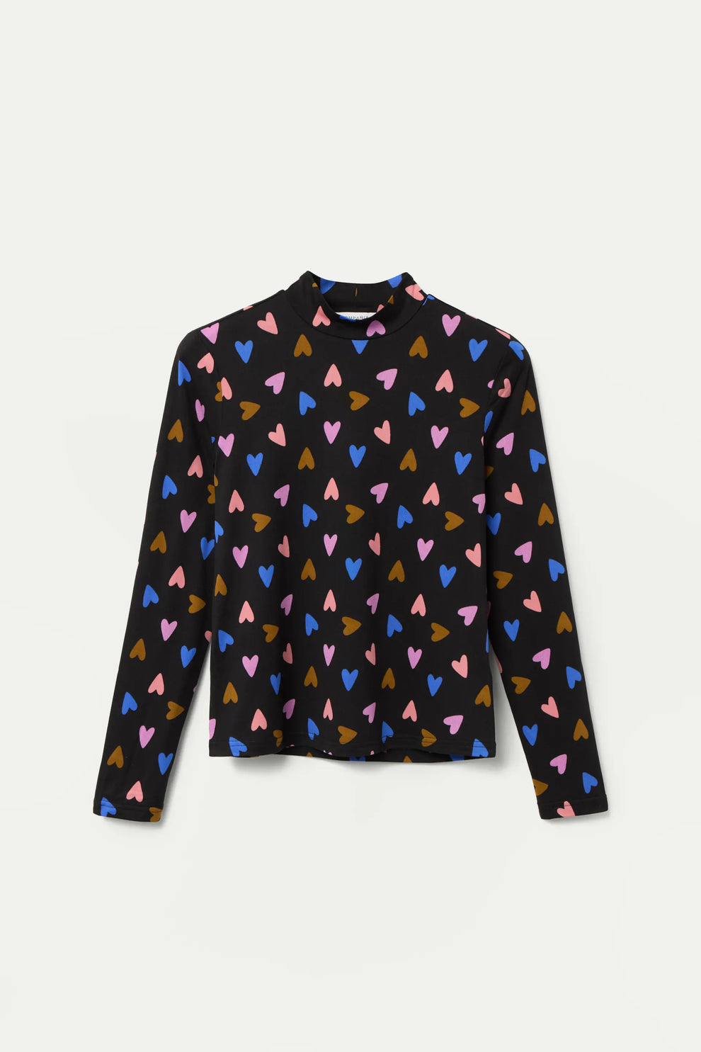 Potpourri print fabric T-shirt. Mock neck and long sleeves. Slightly dropped shoulders. The model is 177 cm tall and is wearing a size S.