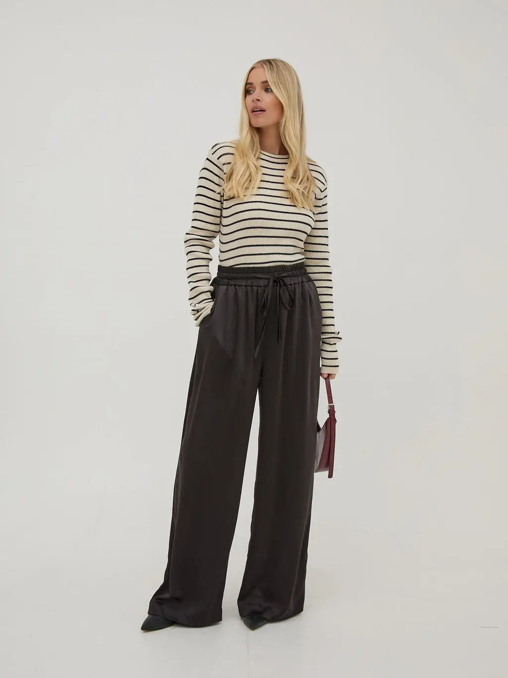 Our Ebba Wide-Leg Trousers are back in our original black satin, a bestselling style that sold out in days last year. With a relaxed wide-leg cut and fully elasticated waistband, they balance comfort and style effortlessly. Practical front pockets and fluid satin fabric make them a versatile piece that can be dressed up or down. Crafted from surplus fabric, these trousers give new life to premium materials while offering a timeless wardrobe staple your customers will return to again and again.