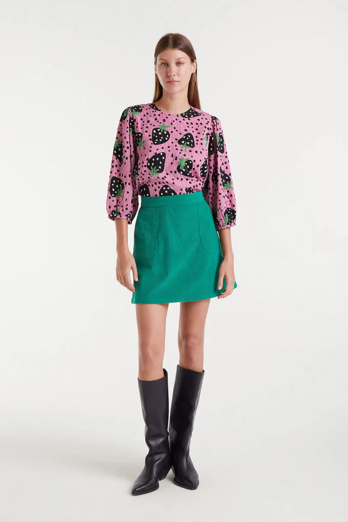 Lightweight, crinkled top with a Morango Big print. Round neck and long, three-quarter sleeves. Button closure at the back. The model is 177 cm tall and is wearing a size S.