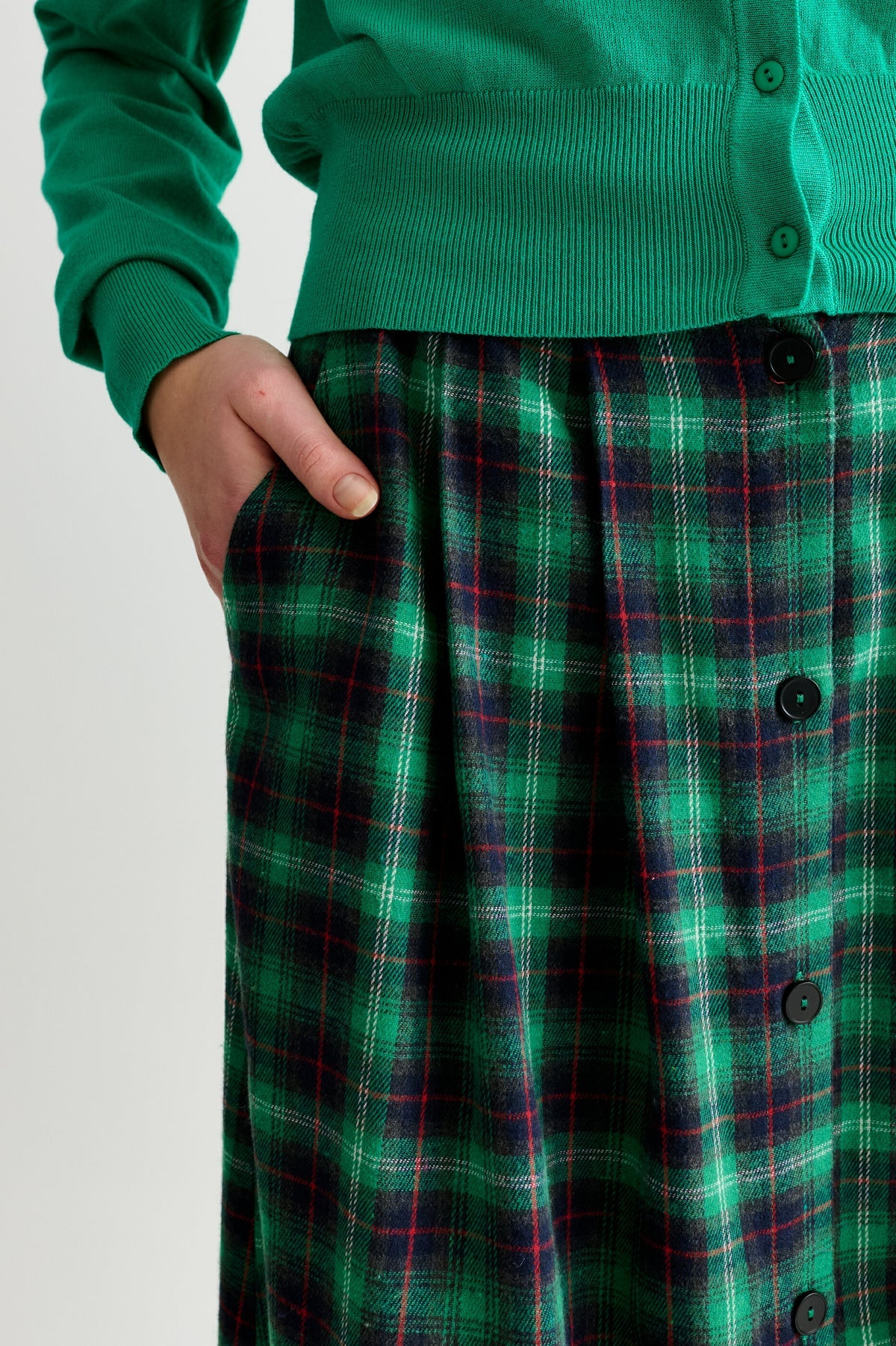The Bia Green Winter Check button through midaxi skirt is the perfect autumn essential. Its wide hem sweep adds a playful touch, making it easy to style with our bright blue Octavia blouse or your favourite black polo neck top. Ready to take you from crisp mornings to cosy evenings in effortless style.